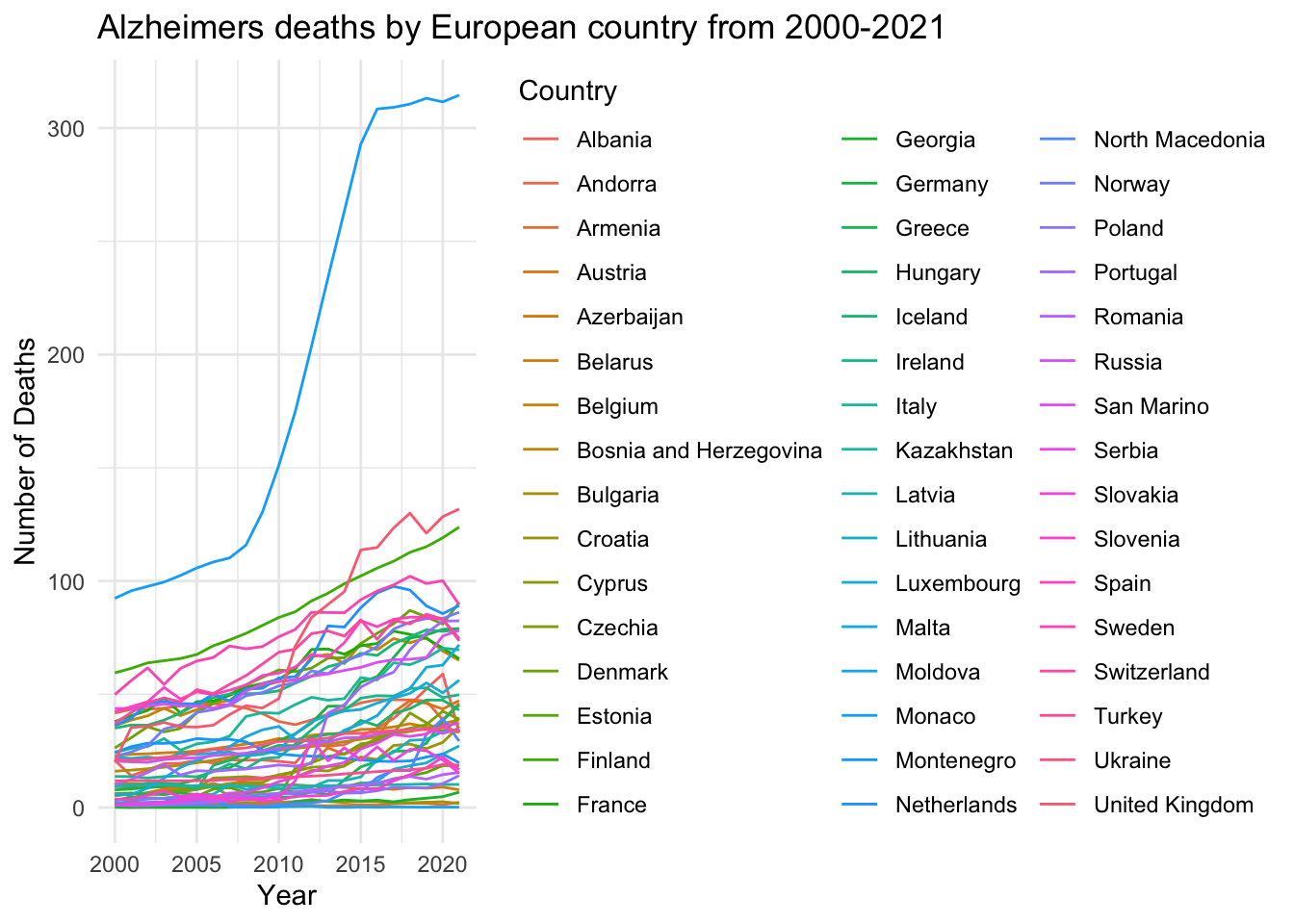 labs (title = "Alzheimers deaths by European country from 2000-2021",