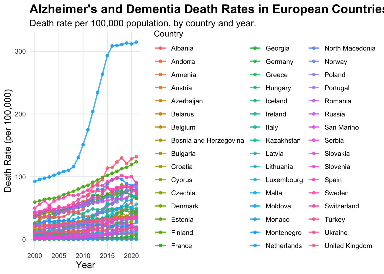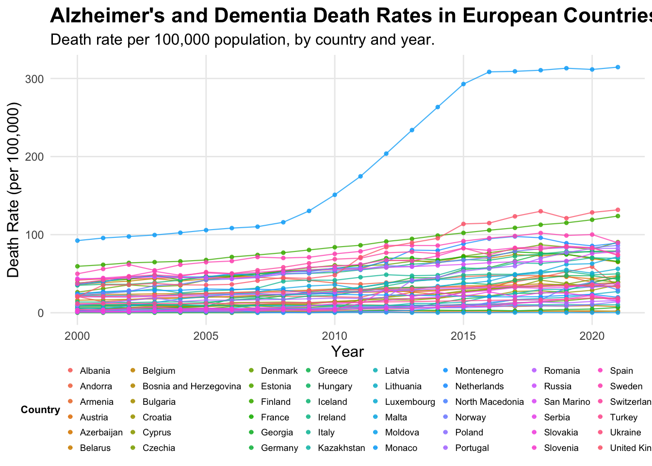 title = "Alzheimer's and Dementia Death Rates in European Countries Over Time",