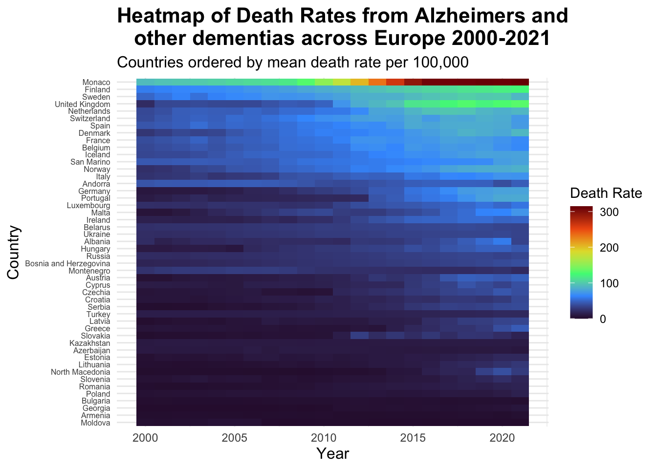 Death rates from Alzheimer’s disease and other forms of dementia across Europe from 2000-2021.
